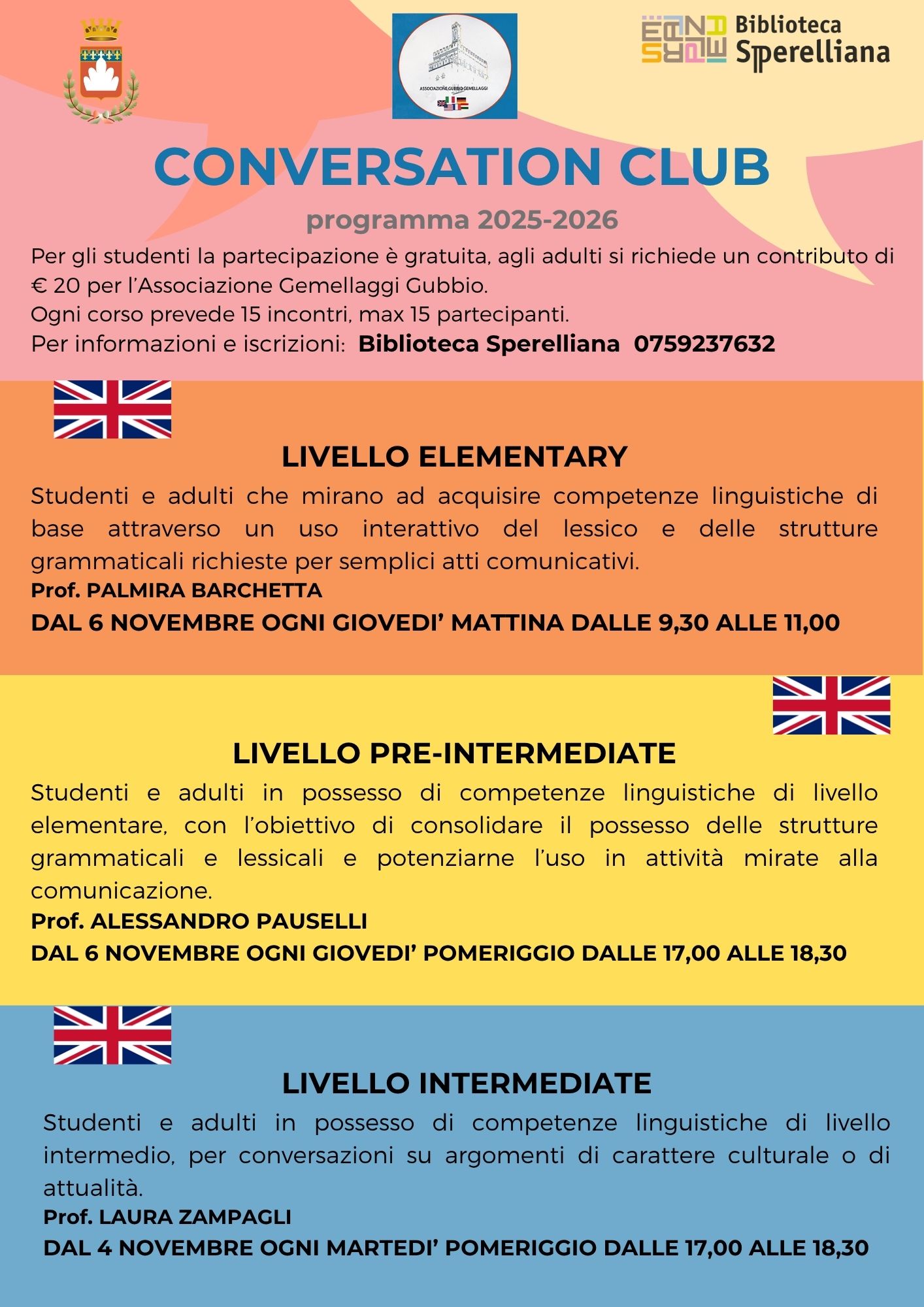 LIVELLO ELEMENTARY: dal 6 novembre ogni giovedì mattina dalle 9,30 alle 11,00 LIVELLO PRE-INTERMEDIATE: dal 6 novembre ogni giovedì pomeriggio dalle 17,00 alle 18,30 LIVELLO INTERMEDIATE: dal 4 novembre ogni martedì pomeriggio dalle 17,00 alle 18,30